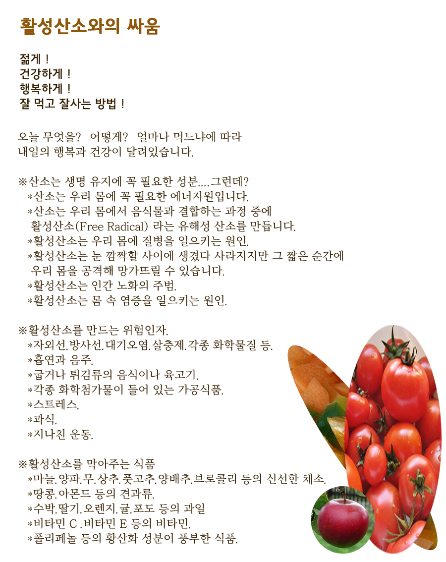 노화로 인한 여러 증상을 예방해 주어 젊음 유지에도 많은 도움이 됩니다.