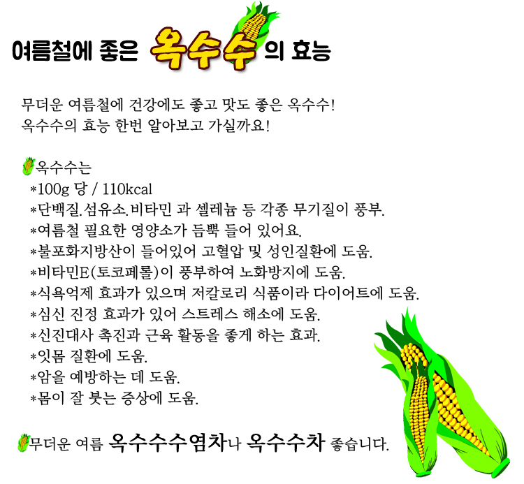 심혈관질환 등의 예방효과가 있으며, 옥수수에 들어있는 '레티놀 성'성분은